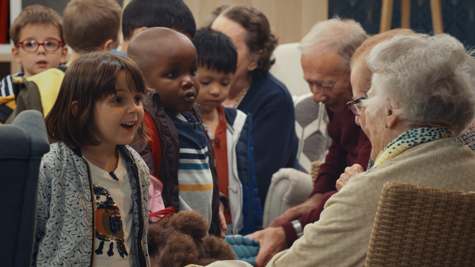Ce documentaire raconte l'histoire d'une rencontre entre plusieurs générations au sein d'un Ehpad. Durant six semaines, les pensionnaires de l'établissement ont reçu la visite d'une classe de maternelle. Les enfants âgés de 5 et 6 ans se sont immiscés dans le quotidien des nonagénaires donnant lieu à des scènes drôles et touchantes. Les résultats sur le plan thérapeutique et éducatif eux sont surprenants. Même si la Covid-19 a mis un frein à ce genre d'initiatives, elle n'en reste pas moins une expérience sociale et humaine extraordinaire et pleine d'avenir.